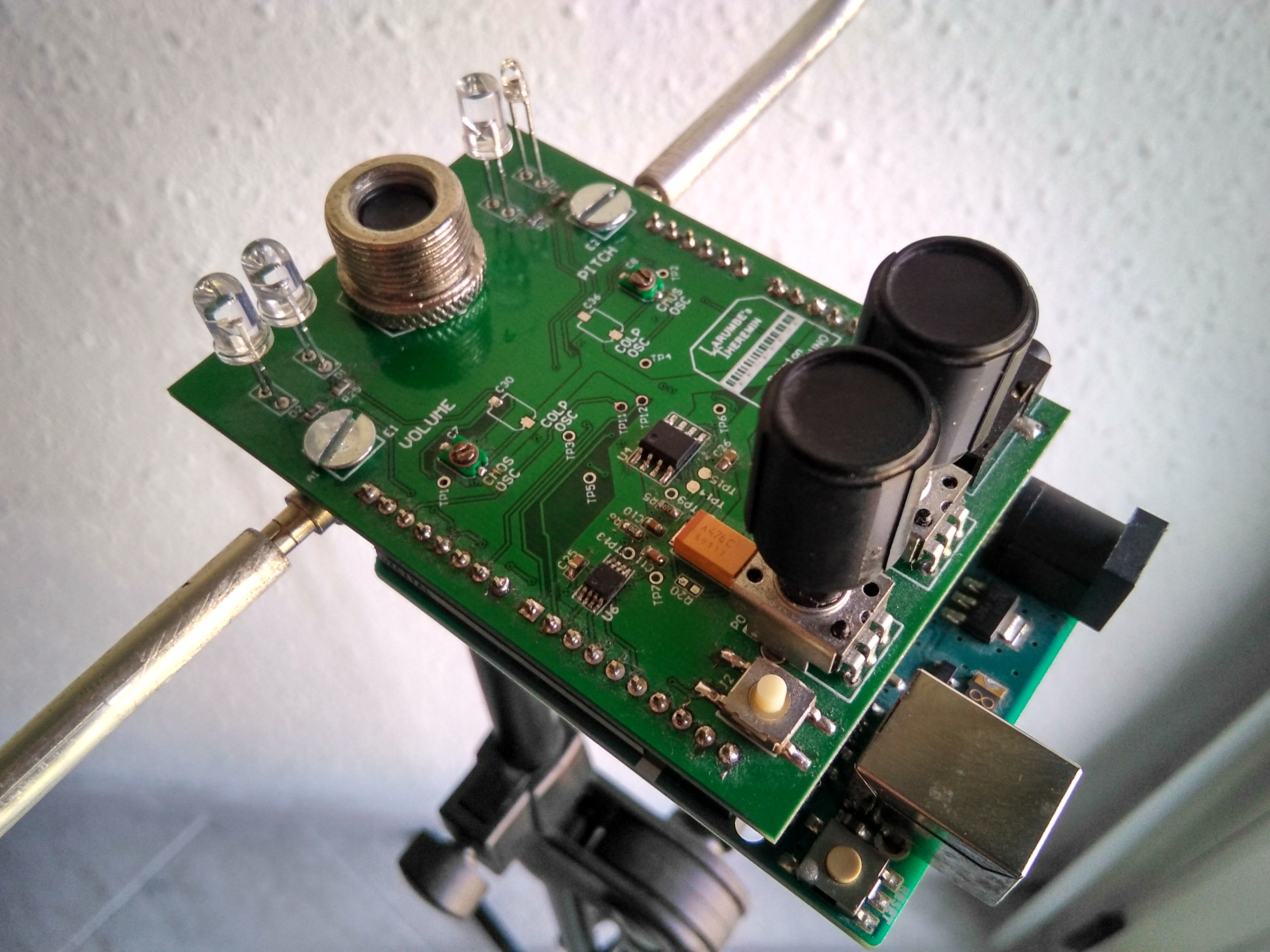 Theremin: the popular electronic musical instrument consisting of two antennas that control pitch and volume. Project is targeted at an Arduino UNO board and includes C sources plus schematics/layouts.